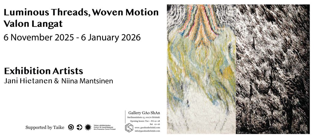 Helsinkiläisessä Gallery GAo ShAnissa avautui juuri Niina Mantsisen ja Jani Hietasen yhteisnäyttely Luminous Threads, Woven Motion. Näyttelyssä Mantsisen tekstiiliteokset yhdistyvät Hietasen liikkuvien kuvien projisointeihin ja muodostavat poikkitaiteellisen dialogin.