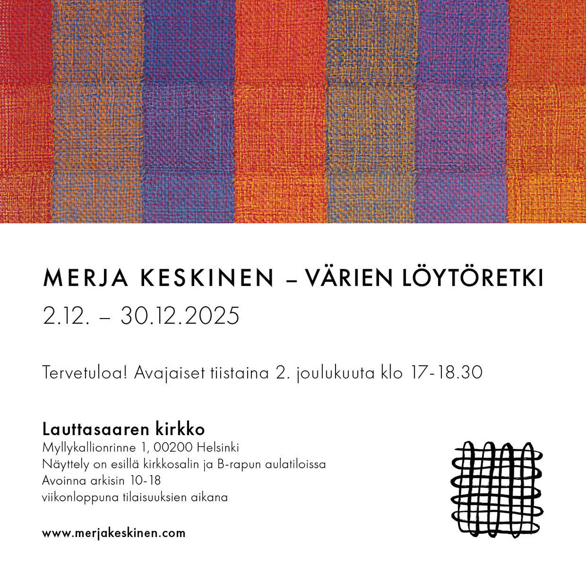 Joulukuun alussa avautuva Merja Keskisen näyttely johdattelee katsojat löytöretkelle värien maailmaan. Teokset pohjautuvat väriopillisiin pohdintoihin ja muutosten kuvaamiseen värien sävyssä, tummuudessa ja puhtaudessa. Taiteilijan käsissä langoista rakentuu teoksia, joissa värit hehkuvat tuhansissa sävyissä.