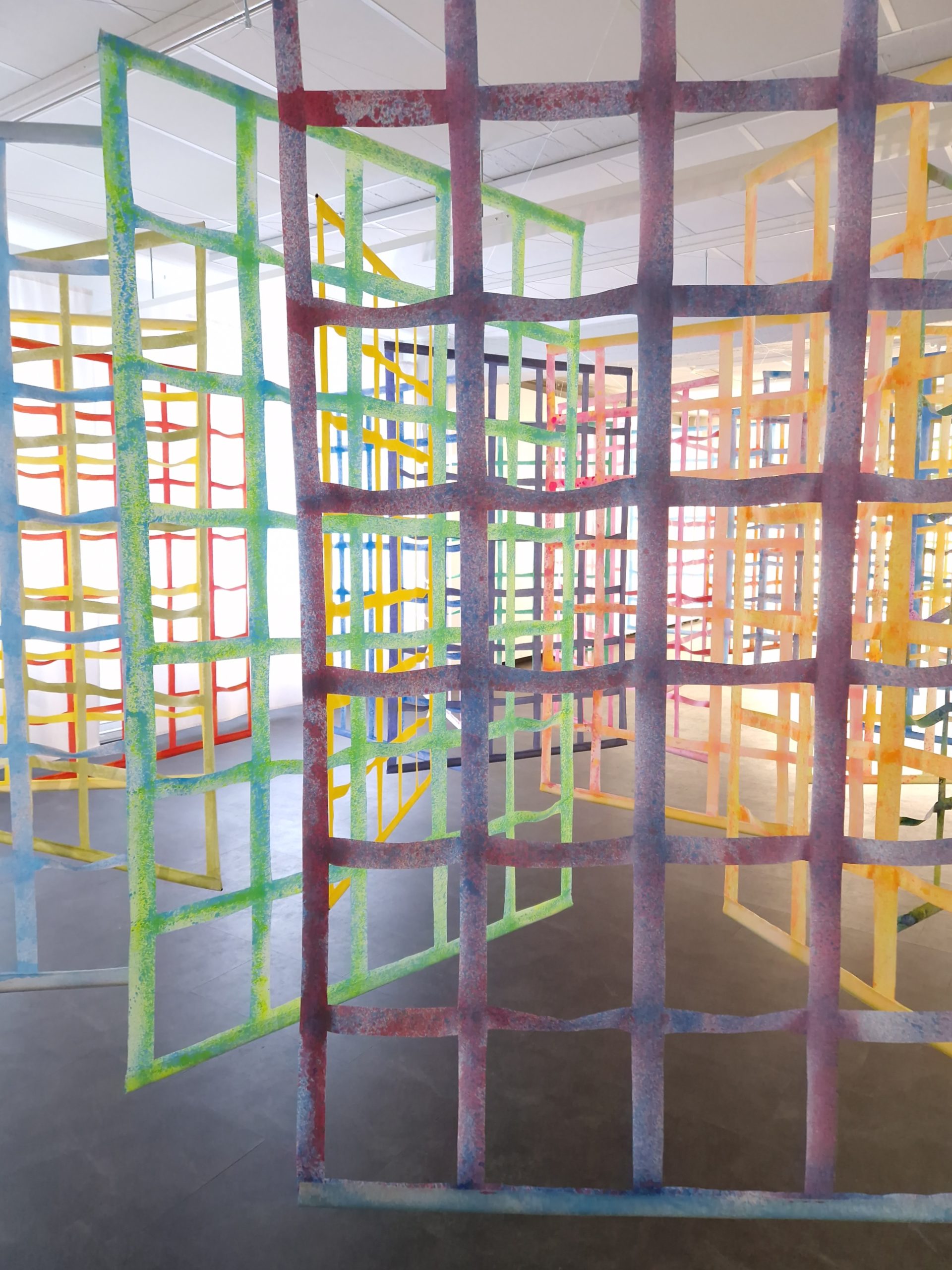 Mittakaava Pöykön töissä on suuri, A4-koko muuntuu useimmiten lakanan kokoiseksi, tilalliseksi elementiksi ja tekstiilitaiteilijana hänellä on kyky lukea ja tulkita tilaa.